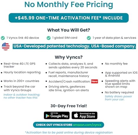 Vyncs – GPS Tracker for Vehicles, [No Monthly Fee], 4G LTE, Vehicle Location, Trip History, Driving Alerts, GeoFence, Fuel Economy, OBD Fault Codes, USA-Developed, Family or Fleets